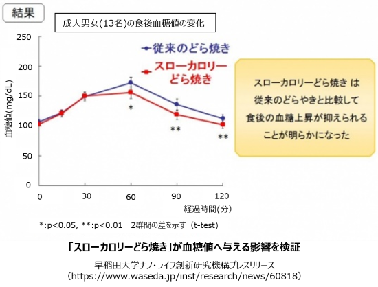 高見澤先生との共同研究で、「スローカロリーどら焼き」は通常の製品に比べて、食後血糖の上昇が穏やかであることを確認しております。
